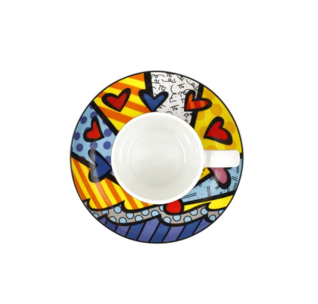 "A new day", 100% made of German Porcelain Designed exclusively by Romero Britto, famous Brazilian designer for Goebel Porzellan Comes in a set of two cups Dimensions: 7 cm height x 0,1 l See more: Give peace a chancee/ SOMETHING ABOUT The brand Goebel, means the highest standards of quality. Since the founding of the company, special emphasis has always been given to artistic expression, quality and the finest craftsmanship. At Goebel you experience how, in close cooperation with renowned artists and designers, objects of porcelain, glass and similar materials become something very special. This is what the founders envisioned, and this is what quickly made Goebel an international success story. In February 2011 Goebel successfully entered the world of Pop Art with the launch of the Romero Britto range. Ever since, Goebel succeeded in enthusing contemporary artists to work with porcelain and glass. Great paintings and daring designs become objects of perfect craftsmanship. The transformation of the Pop Art motives onto porcelain and glass is done in close cooperation with the artists to bring out the best of their unique style. Romero Britto uses vibrant colours and bold patterns as a visual language of hope and happiness. He has been credited with the largest public art installation in Hyde Park history and exhibited at the Louvre Museum - an art that appeals to all! His works of art are primarily devoted to the topics of love, friendship, hope and joy Learn more: https://theculturetrip.com/south-america/brazil/articles/a-splash-of-colour-the-work-of-romero-britto