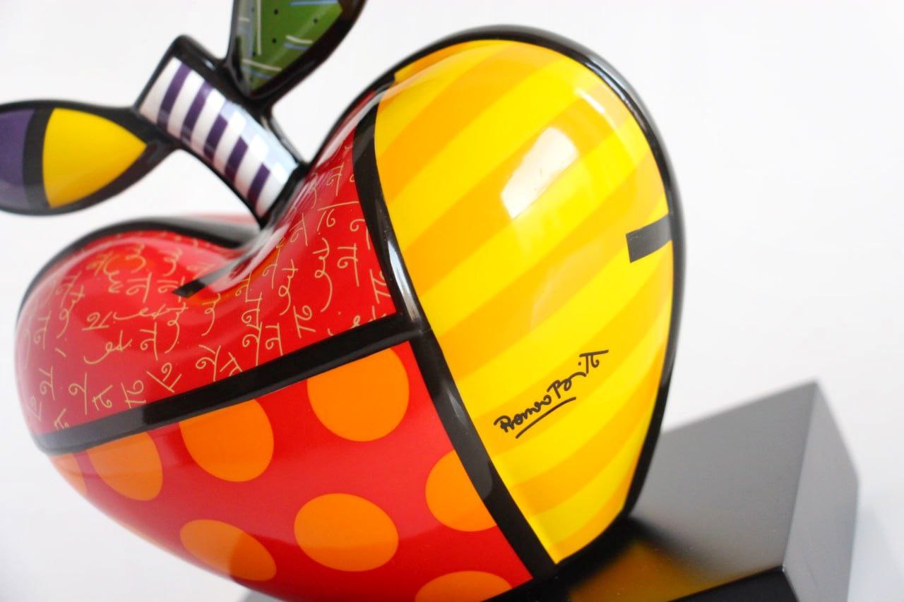 "Big apple", 100% made of German Porcelain Designed exclusively by Romero Britto, famous Brazilian designer for Goebel Porzellan Dimensions: 17 cm height See more: Celebration sunrise SOMETHING ABOUT The brand Goebel, means the highest standards of quality. Since the founding of the company, special emphasis has always been given to artistic expression, quality and the finest craftsmanship. At Goebel you experience how, in close cooperation with renowned artists and designers, objects of porcelain, glass and similar materials become something very special. This is what the founders envisioned, and this is what quickly made Goebel an international success story. In February 2011 Goebel successfully entered the world of Pop Art with the launch of the Romero Britto range. Ever since, Goebel succeeded in enthusing contemporary artists to work with porcelain and glass. Great paintings and daring designs become objects of perfect craftsmanship. The transformation of the Pop Art motives onto porcelain and glass is done in close cooperation with the artists to bring out the best of their unique style. Romero Britto uses vibrant colours and bold patterns as a visual language of hope and happiness. He has been credited with the largest public art installation in Hyde Park history and exhibited at the Louvre Museum - an art that appeals to all! His works of art are primarily devoted to the topics of love, friendship, hope and joy Learn more: https://theculturetrip.com/south-america/brazil/articles/a-splash-of-colour-the-work-of-romero-britto