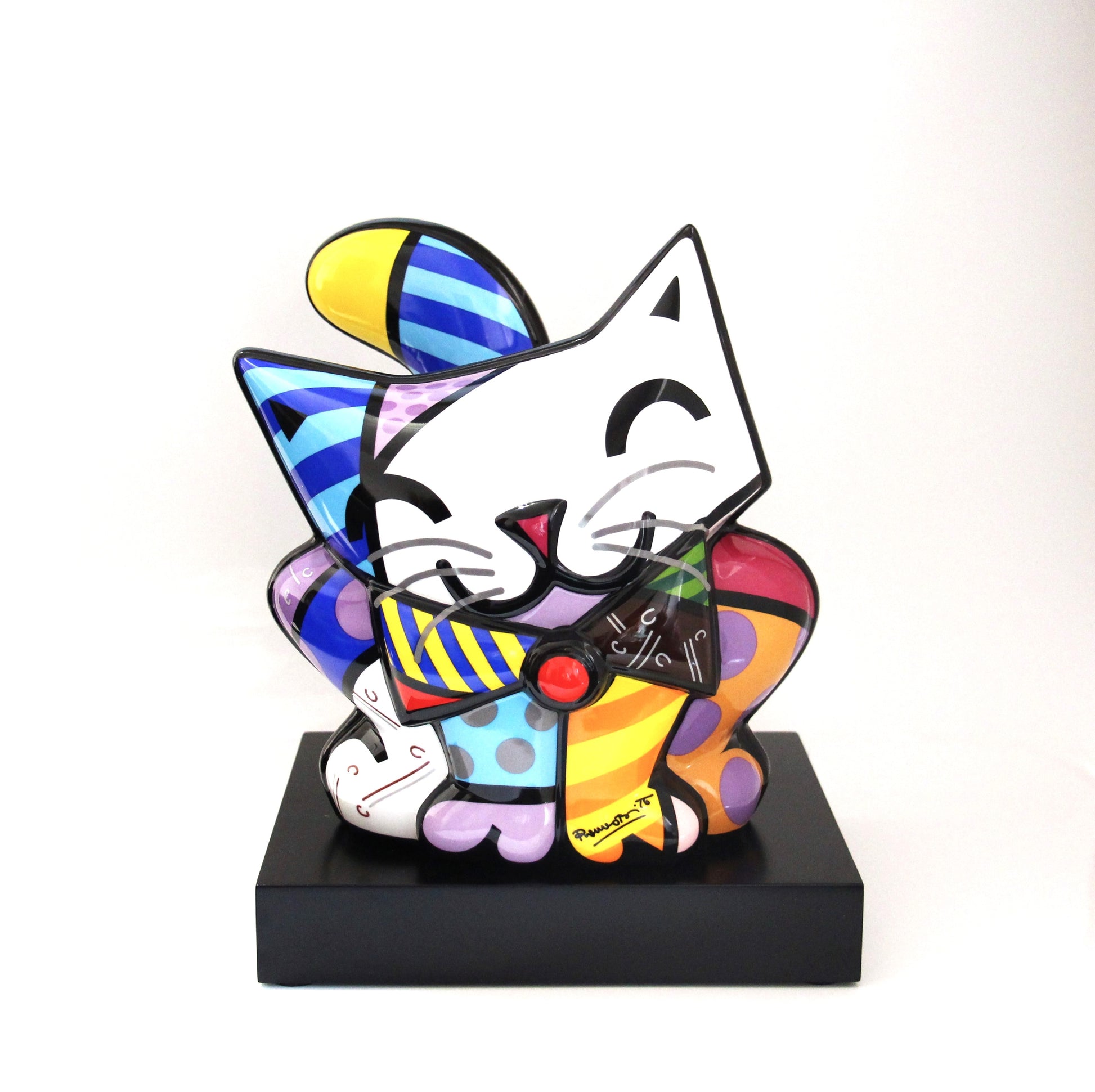 "Blue cat" - Pop art, 100% made of German Porcelain Designed exclusively by Romero Britto, famous Brazilian designer for Goebel Porzellan Dimensions: 30,5 cm height See more: Frog queen- pop art SOMETHING ABOUT The brand Goebel, means the highest standards of quality. Since the founding of the company, special emphasis has always been given to artistic expression, quality and the finest craftsmanship. At Goebel you experience how, in close cooperation with renowned artists and designers, objects of porcelain, glass and similar materials become something very special. This is what the founders envisioned, and this is what quickly made Goebel an international success story. In February 2011 Goebel successfully entered the world of Pop Art with the launch of the Romero Britto range. Ever since, Goebel succeeded in enthusing contemporary artists to work with porcelain and glass. Great paintings and daring designs become objects of perfect craftsmanship. The transformation of the Pop Art motives onto porcelain and glass is done in close cooperation with the artists to bring out the best of their unique style. Romero Britto uses vibrant colours and bold patterns as a visual language of hope and happiness. He has been credited with the largest public art installation in Hyde Park history and exhibited at the Louvre Museum - an art that appeals to all! His works of art are primarily devoted to the topics of love, friendship, hope and joy Learn more: https://theculturetrip.com/south-america/brazil/articles/a-splash-of-colour-the-work-of-romero-britto