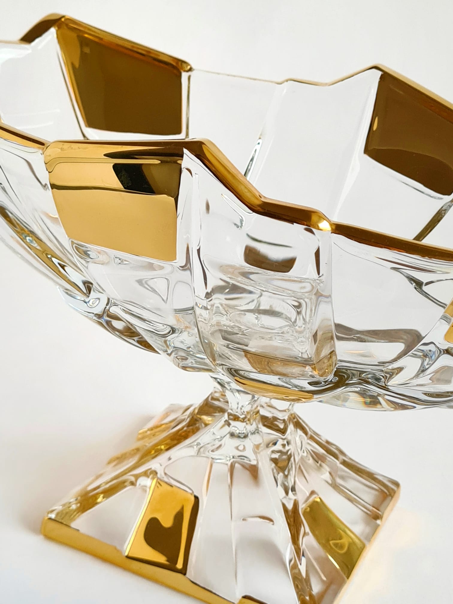 Authentic Czech crystal fruit bowl on foot- sydney , gold plated exclusively for our e-store. Bowl is elevated by a foot giving it additional elegance and a dash of luxury. Dimensions: 38 cm width Take a look at similar nice things: Crystal oval bowl on foot - ocean BRIEF HISTORY OF BOHEMIA JIHLAVA In 1845, Karl Anton established a glass factory in Antonínův Důl, near Jihlava in the Bohemian-Moravian Highlands. This marked the beginning of Bohemia Jihlava’s journey in artisanal glassmaking. Anton used the region’s natural resources and local glassmaking techniques to create a successful glass production empire. The rich cultural traditions of the Bohemian-Moravian Highlands played a vital role in shaping Bohemia Jihlava’s legacy in traditional glassmaking. The land of Bohemia already gained great fame during the Renaissance for its beautiful and colorful glass. The discovery of new materials and techniques by Bohemian glass-workers was to ahead, their clear glass win even Italian glass in quality. The term „Bohemian crystal“ was coined in the 16th century to contrast it from glass made elsewhere. Czech crystal gained global recognition for its meticulous craftsmanship and traditional techniques. Bohemia Jihlava prioritizes heritage, quality, and craftsmanship in upholding its reputation in the crystal market over our whole time of existence. Bohemia Jihlava stands out in the design world by blending tradition and timelessness, example is this beautiful crystal fruit bowl on foot- sydney. Our design celebrates raw beauty and creating products that embody enduring values and rich Czech heritage. This devotion to precise design is not just a milestone in the company’s history, but a guiding example that continues to shape our future. https://www.bohemiajihlava.com/