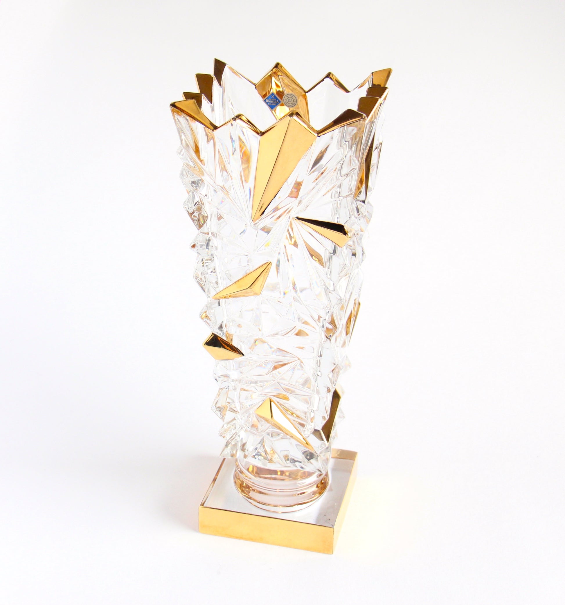 Authentic czech crystal vase on foot- glacier, gold plated exclusively for our store Dimensions: 38 cm (14.9 in) Take a look similar nice things: Crystal vase on foot with gold - Lisboa BRIEF HISTORY OF BOHEMIA JIHLAVA In 1845, Karl Anton established a glass factory in Antonínův Důl, near Jihlava in the Bohemian-Moravian Highlands. This marked the beginning of Bohemia Jihlava’s journey in artisanal glassmaking. Anton used the region’s natural resources and local glassmaking techniques to create a successful glass production empire. The rich cultural traditions of the Bohemian-Moravian Highlands played a vital role in shaping Bohemia Jihlava’s legacy in traditional glassmaking. The land of Bohemia already gained great fame during the Renaissance for its beautiful and colorful glass. The discovery of new materials and techniques by Bohemian glass-workers was to ahead, their clear glass win even Italian glass in quality. The term „Bohemian crystal“ was coined in the 16th century to contrast it from glass made elsewhere. Czech crystal gained global recognition for its meticulous craftsmanship and traditional techniques. Bohemia Jihlava prioritizes heritage, quality, and craftsmanship in upholding its reputation in the crystal market over our whole time of existence. Bohemia Jihlava stands out in the design world by blending tradition and timelessness, example is this beautiful crystal vase on foot- glacier. Our design celebrates raw beauty and creating products that embody enduring values and rich Czech heritage. This devotion to precise design is not just a milestone in the company’s history, but a guiding example that continues to shape our future. https://www.bohemiajihlava.com/