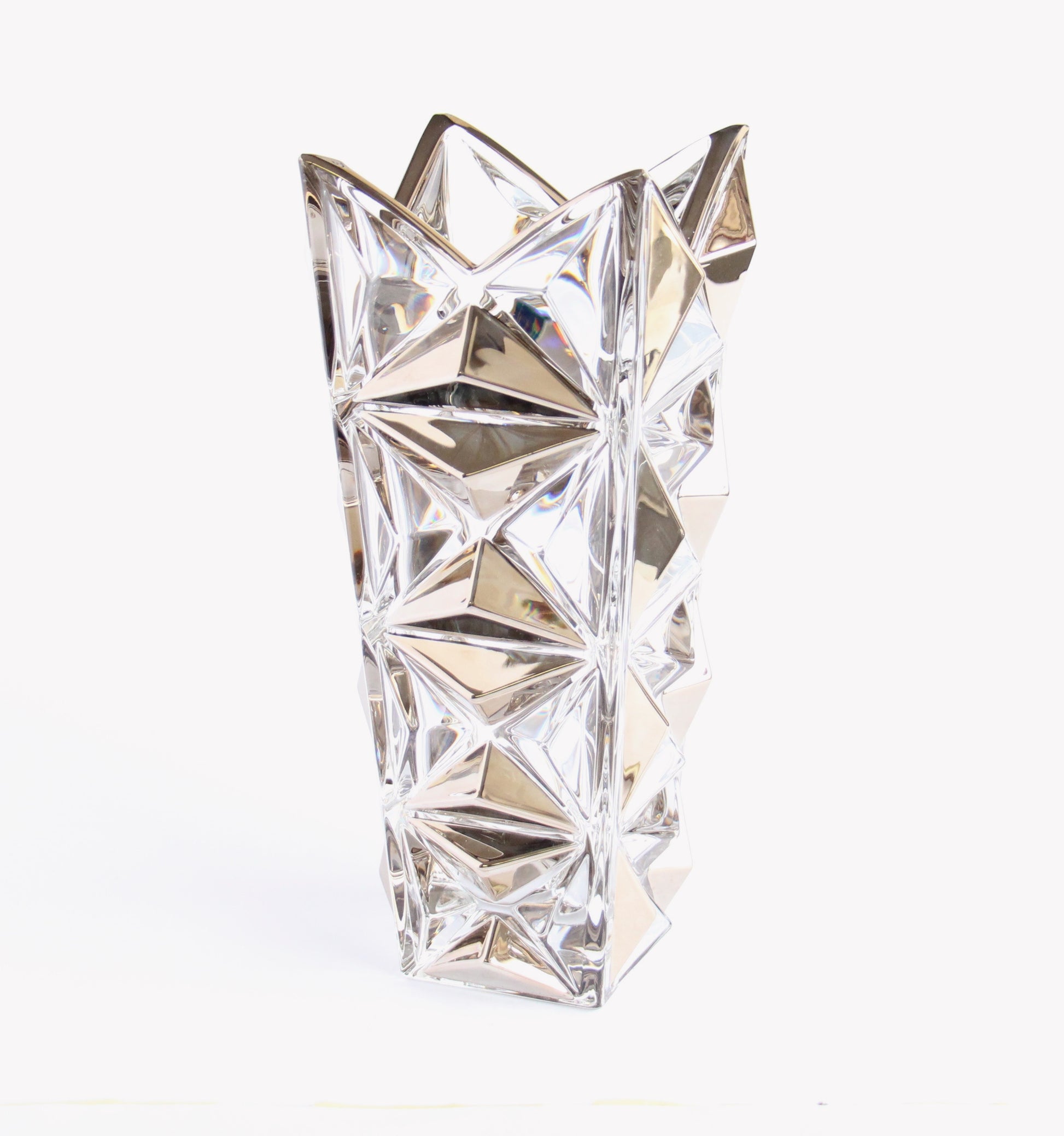 Authentic czech crystal vase- pyramid, platinum plated for our e-store 24% lead crystal Dimensions: 30 cm Take a look similar nice things: Crystal vase on foot with gold - Lisboa BRIEF HISTORY OF BOHEMIA JIHLAVA In 1845, Karl Anton established a glass factory in Antonínův Důl, near Jihlava in the Bohemian-Moravian Highlands. This marked the beginning of Bohemia Jihlava’s journey in artisanal glassmaking. Anton used the region’s natural resources and local glassmaking techniques to create a successful glass production empire. The rich cultural traditions of the Bohemian-Moravian Highlands played a vital role in shaping Bohemia Jihlava’s legacy in traditional glassmaking. The land of Bohemia already gained great fame during the Renaissance for its beautiful and colorful glass. The discovery of new materials and techniques by Bohemian glass-workers was to ahead, their clear glass win even Italian glass in quality. The term „Bohemian crystal“ was coined in the 16th century to contrast it from glass made elsewhere. Czech crystal gained global recognition for its meticulous craftsmanship and traditional techniques. Bohemia Jihlava prioritizes heritage, quality, and craftsmanship in upholding its reputation in the crystal market over our whole time of existence. Bohemia Jihlava stands out in the design world by blending tradition and timelessness, example is this beautiful crystal vase- pyramid. Our design celebrates raw beauty and creating products that embody enduring values and rich Czech heritage. This devotion to precise design is not just a milestone in the company’s history, but a guiding example that continues to shape our future. https://www.bohemiajihlava.com/