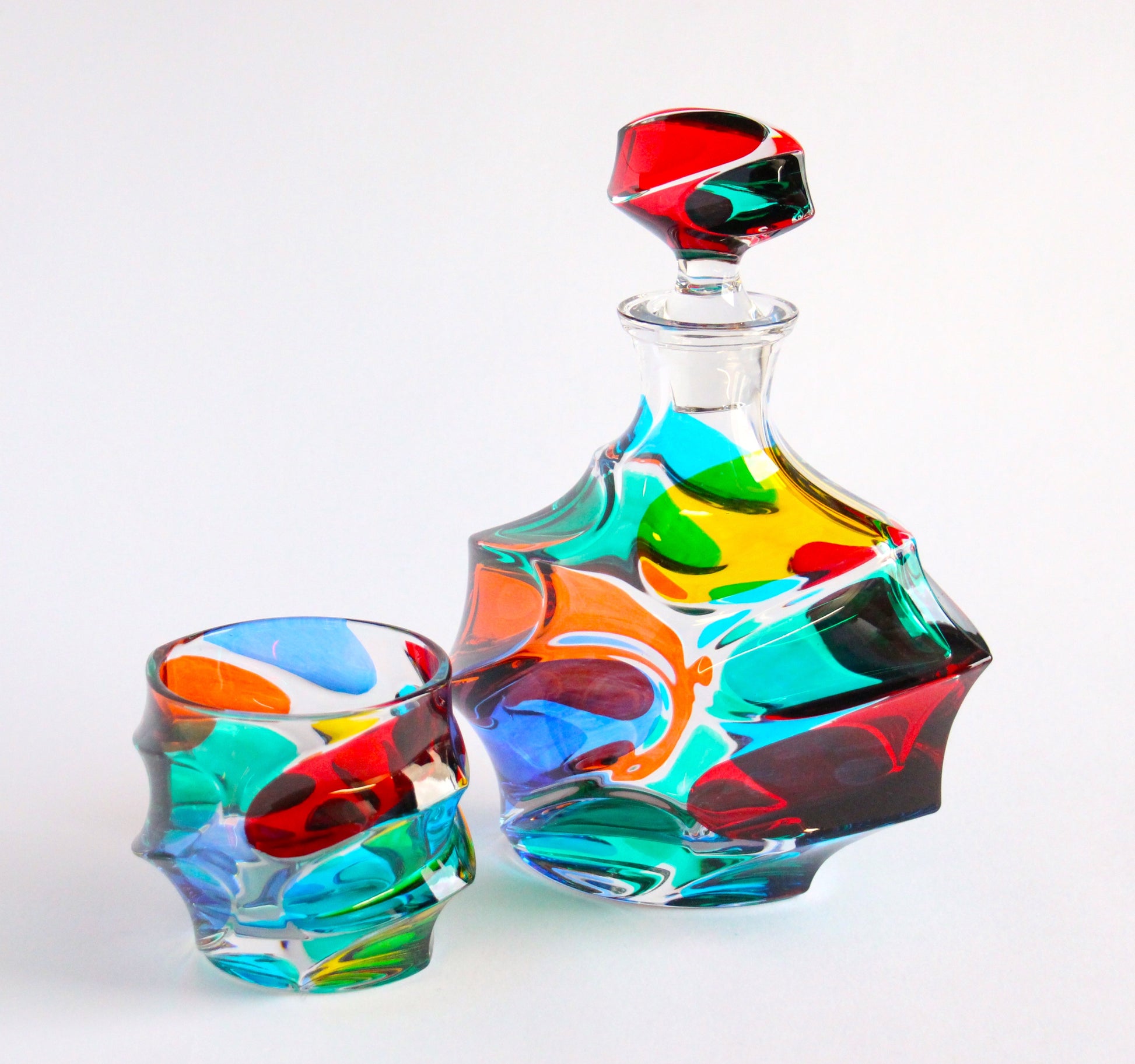 Colorful Czech crystal whisky set- calypso, 100% hand painted Set contains 6 pcs Dimensions: 9.5cm / 300 ml Take a look similar nice things: Crystal vase on foot with gold - Lisboa BRIEF HISTORY OF BOHEMIA JIHLAVA In 1845, Karl Anton established a glass factory in Antonínův Důl, near Jihlava in the Bohemian-Moravian Highlands. This marked the beginning of Bohemia Jihlava’s journey in artisanal glassmaking. Anton used the region’s natural resources and local glassmaking techniques to create a successful glass production empire. The rich cultural traditions of the Bohemian-Moravian Highlands played a vital role in shaping Bohemia Jihlava’s legacy in traditional glassmaking. The land of Bohemia already gained great fame during the Renaissance for its beautiful and colorful glass. The discovery of new materials and techniques by Bohemian glass-workers was to ahead, their clear glass win even Italian glass in quality. The term „Bohemian crystal“ was coined in the 16th century to contrast it from glass made elsewhere. Czech crystal gained global recognition for its meticulous craftsmanship and traditional techniques. Bohemia Jihlava prioritizes heritage, quality, and craftsmanship in upholding its reputation in the crystal market over our whole time of existence. Bohemia Jihlava stands out in the design world by blending tradition and timelessness, example is this beautiful crystal whisky set- calypso. Our design celebrates raw beauty and creating products that embody enduring values and rich Czech heritage. This devotion to precise design is not just a milestone in the company’s history, but a guiding example that continues to shape our future. https://www.bohemiajihlava.com/