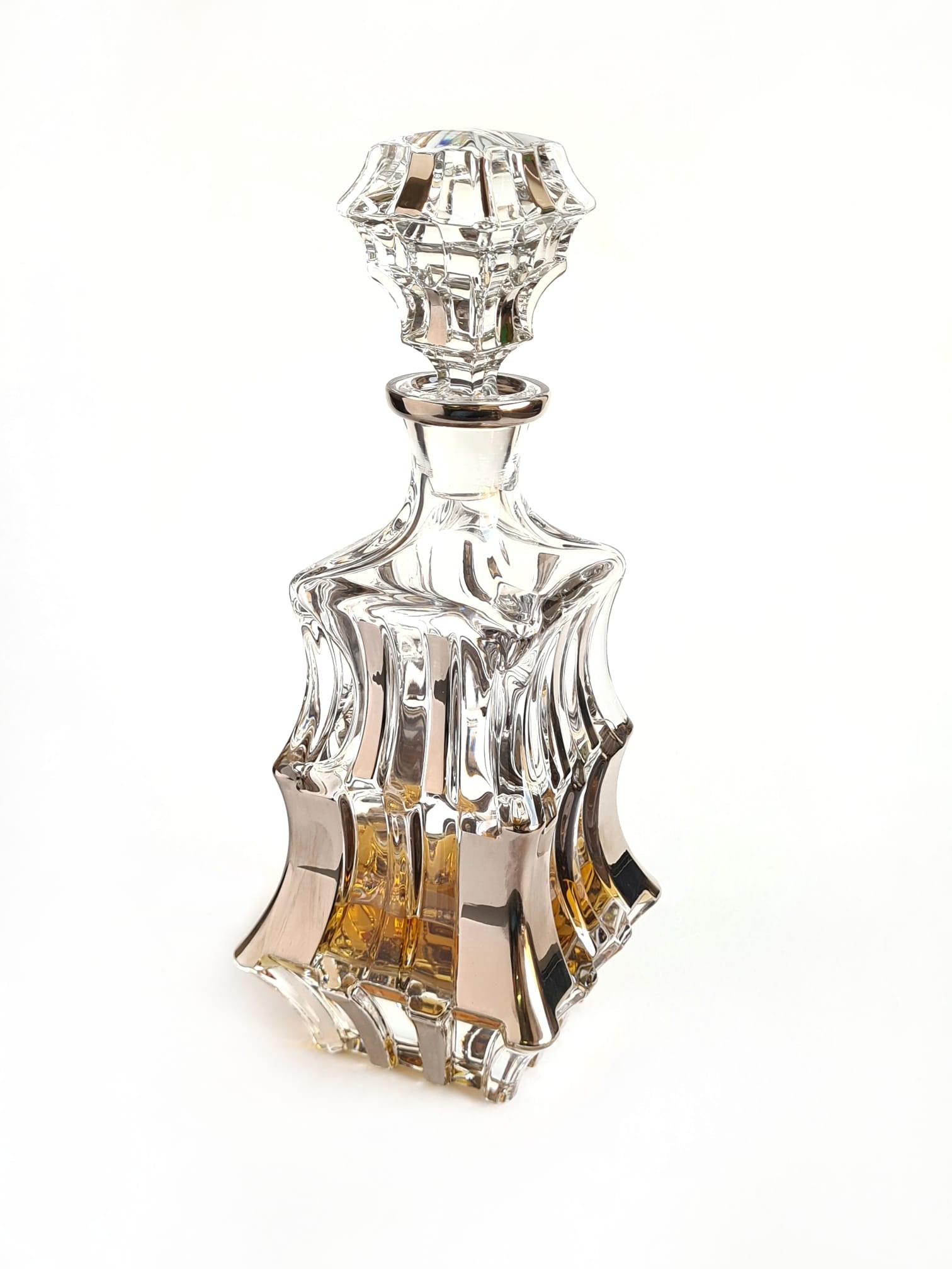 Authentic Czech crystal decanter with platinum- cascade, custom plated with platinum exclusively for our store. Dimensions: 32 cm, 800 ml Take a look at similar nice things: Crystal decanter- samba BRIEF HISTORY OF BOHEMIA JIHLAVA In 1845, Karl Anton established a glass factory in Antonínův Důl, near Jihlava in the Bohemian-Moravian Highlands. This marked the beginning of Bohemia Jihlava’s journey in artisanal glassmaking. Anton used the region’s natural resources and local glassmaking techniques to create a successful glass production empire. The rich cultural traditions of the Bohemian-Moravian Highlands played a vital role in shaping Bohemia Jihlava’s legacy in traditional glassmaking. The land of Bohemia already gained great fame during the Renaissance for its beautiful and colorful glass. The discovery of new materials and techniques by Bohemian glass-workers was to ahead, their clear glass win even Italian glass in quality. The term „Bohemian crystal“ was coined in the 16th century to contrast it from glass made elsewhere. Czech crystal gained global recognition for its meticulous craftsmanship and traditional techniques. Bohemia Jihlava prioritizes heritage, quality, and craftsmanship in upholding its reputation in the crystal market over our whole time of existence. Bohemia Jihlava stands out in the design world by blending tradition and timelessness, example is this beautiful czech crystal decanter with platinum- cascade. Our design celebrates raw beauty and creating products that embody enduring values and rich Czech heritage. This devotion to precise design is not just a milestone in the company’s history, but a guiding example that continues to shape our future. https://www.bohemiajihlava.com/