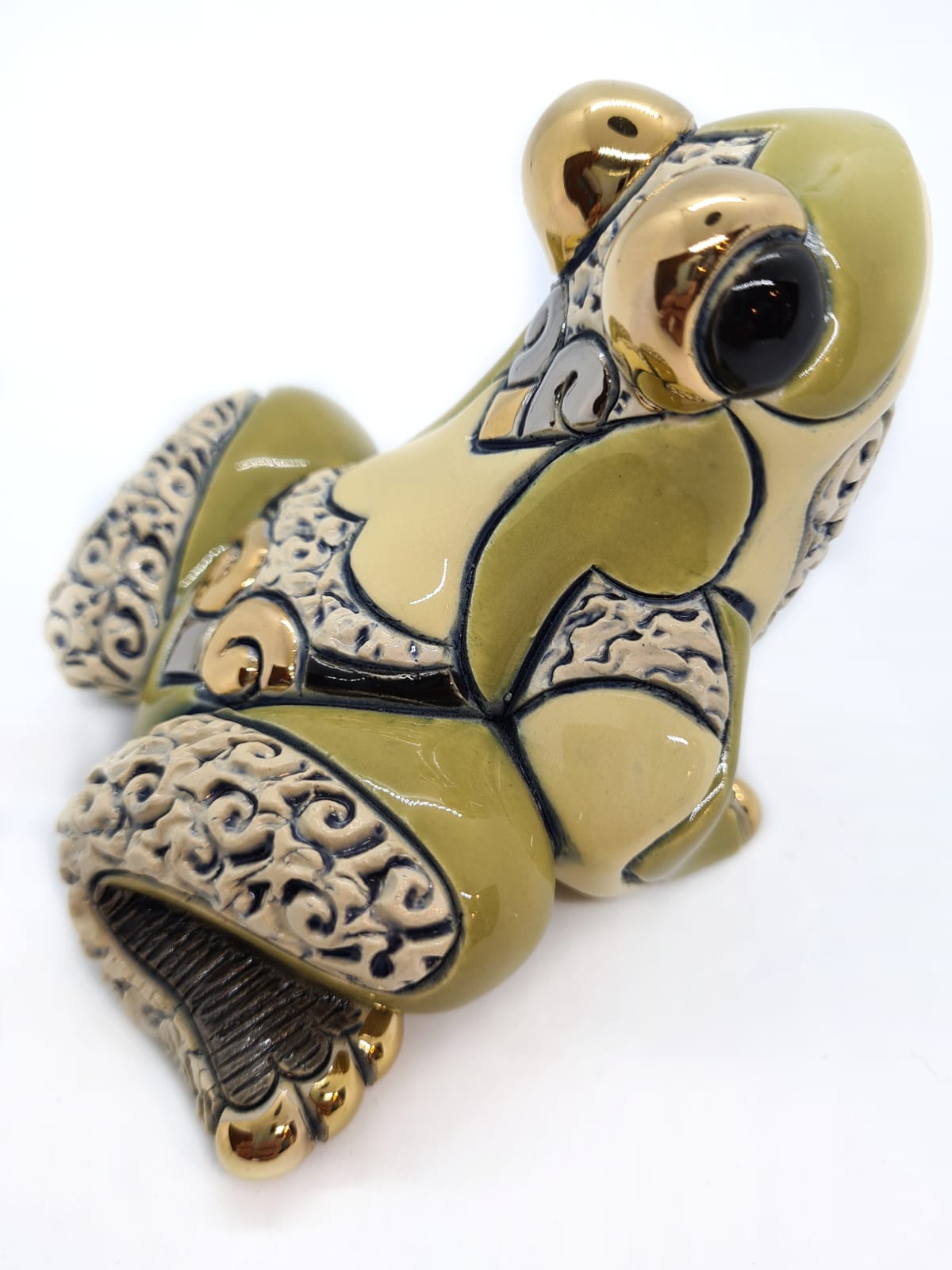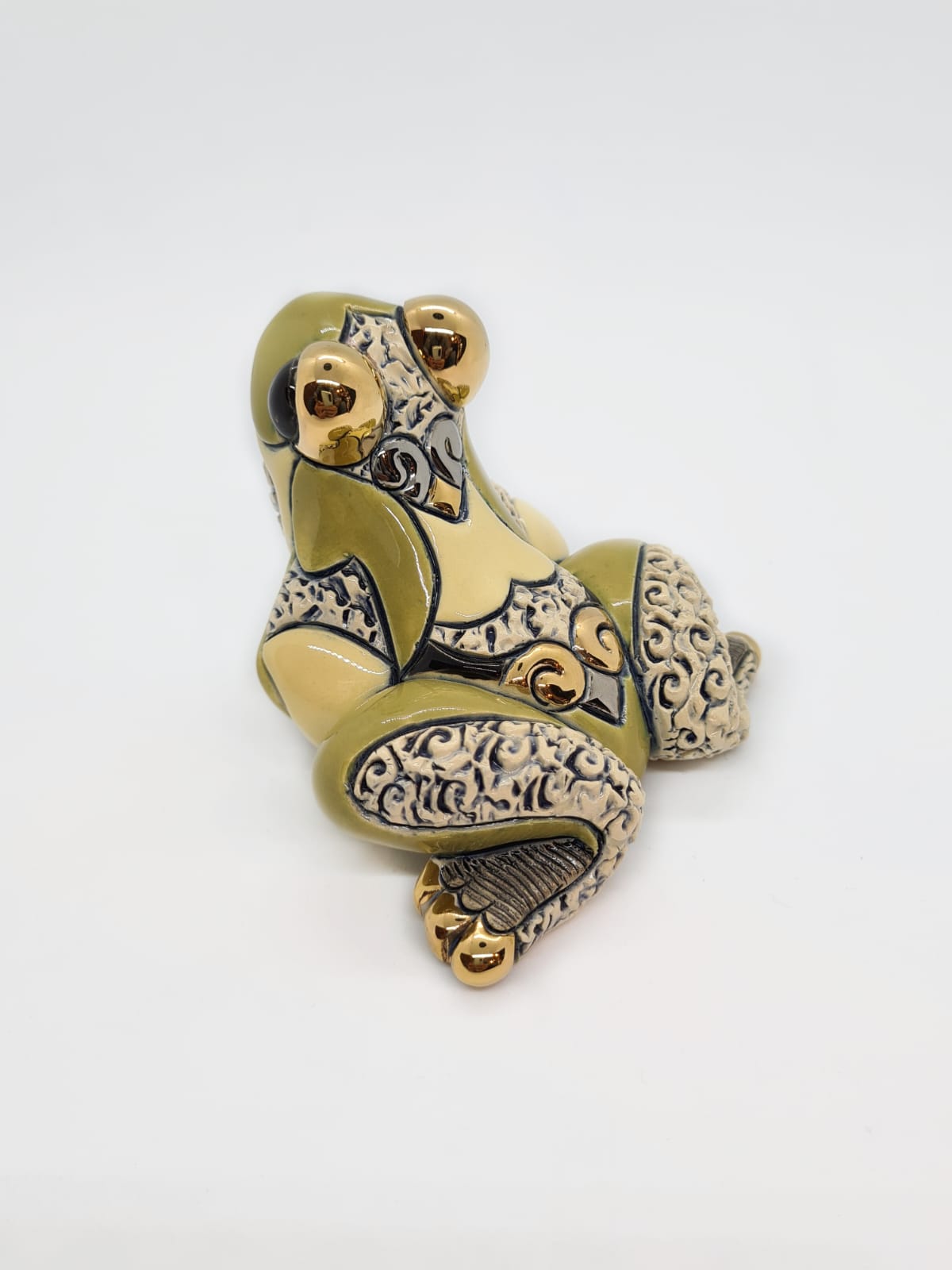 Sculpture of a green jumping frog, 100% hand made of ceramic Dimensions: 09 x 10 x 08 cm Every creation of the De Rosa Collections is the result of a unique handmade process of the highest technical and artistic quality like this jumping frog sculpture. Each figurine is carved and painted by hand. Never two subjects are ever carved exactly the same. Hand carved and hand painted in Uruguay our sculptures are accented with platinum, gold and vibrant enamel glazes. See more: Kitten sitting SOMETHING ABOUT The heritage of De Rosa Collections proudly spans fifty years, when in 1945 Jorge De Rosa Thompson was inspired by the craft of ceramic design. Now run by his son Jorge De Rosa Jr and his daughter Agustina De Rosa, it remains a well-established, family run business producing timeless handmade ceramic figurines. However envolving and reinventing ceramic design through bright colours, original art forms and textures Learn more: https://www.nytimes.com/2021/08/19/t-magazine/ceramic-animal-figurines.html