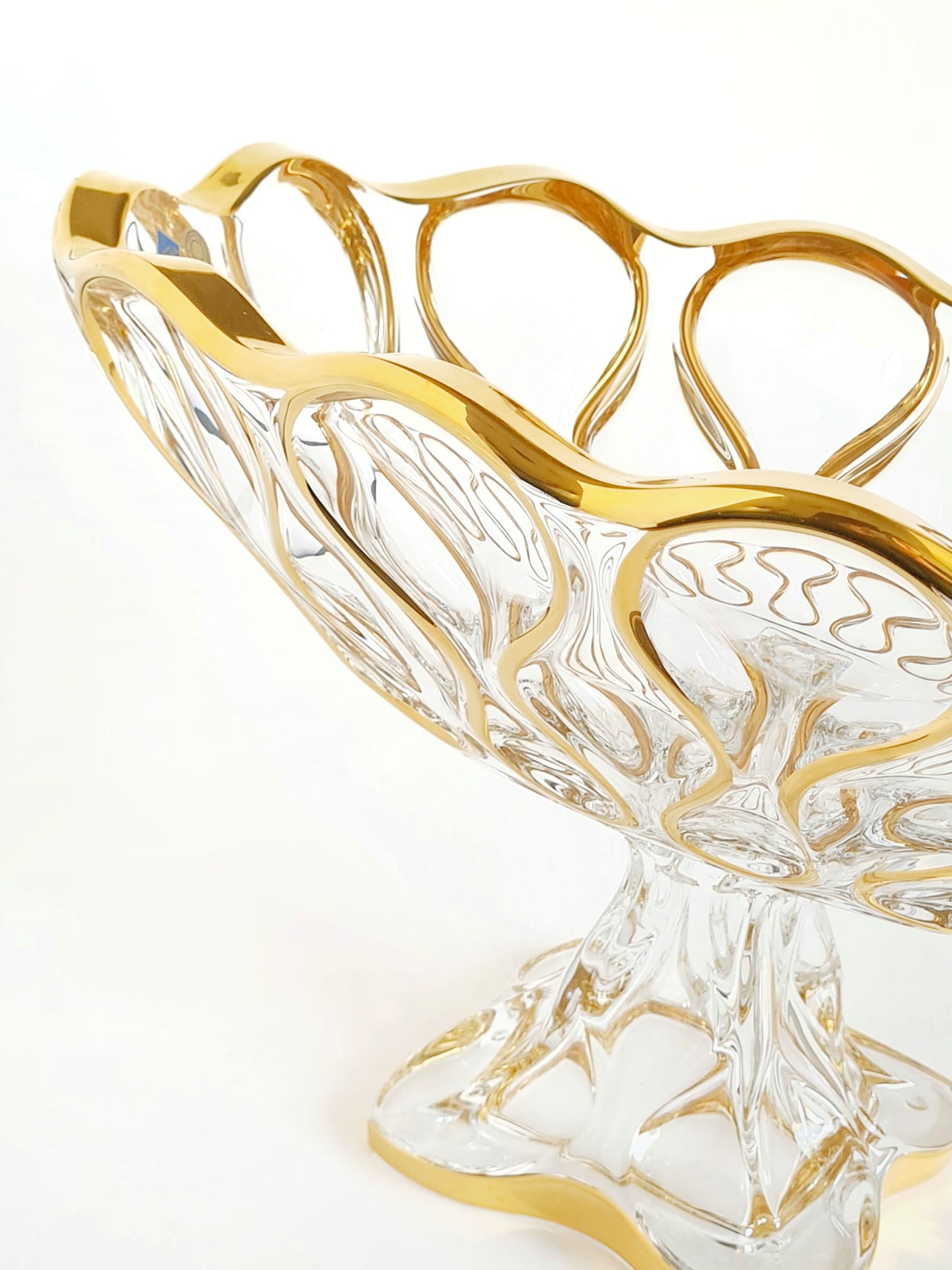 Czech Crystal oval bowl on foot "Ocean", gold plated by hand, exclusively for our e-store Bowl is elevated by a foot giving it additional elegance and a dash of luxury. Dimensions: 37 cm Take a look at similar nice products: Crystal vase on foot with gold - Lisboa