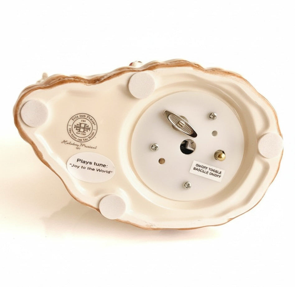 Porcelain sculpture of Santa Claus riding a white horse. The statue is also a carillon, and it plays Christmas music if the button on the bottom side is screwed. Hand made by Fitz & Floyd, globally known American company famous for timeless porcelain sculptures.